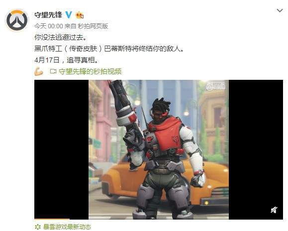 今天,《守望先锋》官方微博公布了英雄巴蒂斯特的新传奇皮肤“黑爪特工”,该皮肤将于4月17日上线。