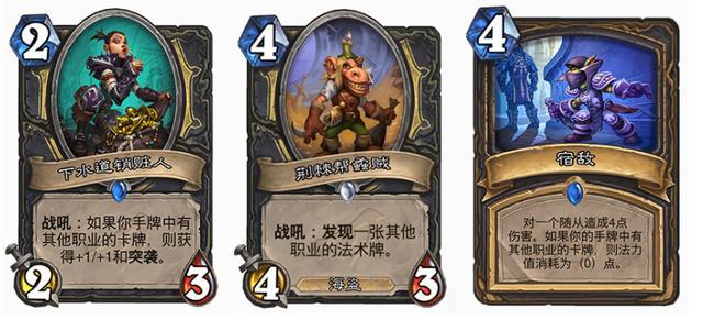 虽然销赃人不能2费准时下,但是在后续作为一个2费3/4突袭解场、补刀也都非常的优质,低费的优点也让他成为重要的连击手段之一。宿命更是如此,非盗贼内战的时候,一个闪狐出场以后,宿命就是0费了,一波无敌解场、返场节奏!而荆棘帮蟊贼不仅因为可以在任何对战中都能触发销赃人和宿命的特效,关键是法术是发现,实战中发现的法术都不差。整体节奏连贯性很强。(蟊贼发现的卡如果都比较一般,个人经验推荐大家拿低费,再怎样都可以配合连击,不至于卡手一万年)