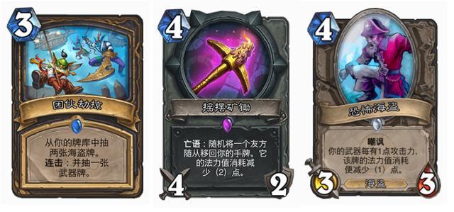 团伙劫掠在这个版本是无敌过牌,3费定向过3张!一把矿锄、2个海盗。虽只有2把武器,但是一般用不到第二张团伙劫掠对手就GG了。所以武器够了,而海盗:1个船工、1个绿皮、2个恐怖海盗、2个蟊贼共6张,无所畏惧!虽然配合伺机待发0费抽3张是无敌节奏,但是3费直接连击过牌也是可以接受的,因为只要过上矿锄和恐怖海盗,4费就是一把刀+一个0费3/3嘲讽。(武器a第二下前请考虑清楚,随从攻击完没有!!!!!武器亡语会回手!会回手!会回手!)