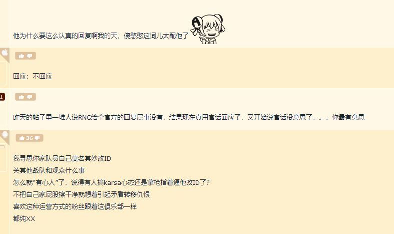 RNG从S8世界赛结束之后,队员的动向似乎就成了粉丝最为关心的话题,S9赛季初期RNG宣布全员续约,这就使得很多粉丝心里的一块石头放下了,而S8春季赛RNG止步八强,Karsa赛后又把自己ID改为了FW JUG,这又使得很多粉丝为其提心吊胆,节奏可以说满天飞!而今日RNG副总裁也首次回应了Karsa改名事件!