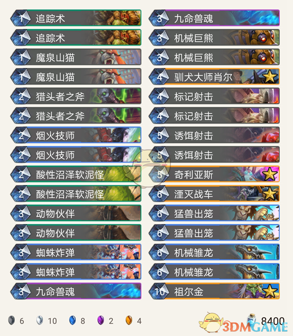 Nalad的一套机械猎,Nalad用这套在乱斗中打了许多12胜,湮灭战车对不起。构筑上采用机械与法术混合的体系,免费的英雄祖尔金谁不要呢?双软的配置主要是针对盗贼的幽灵弯刀与回手刀(4/2)。