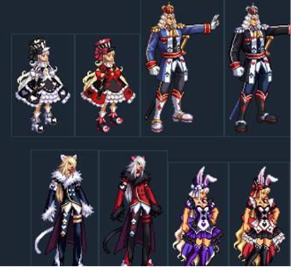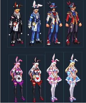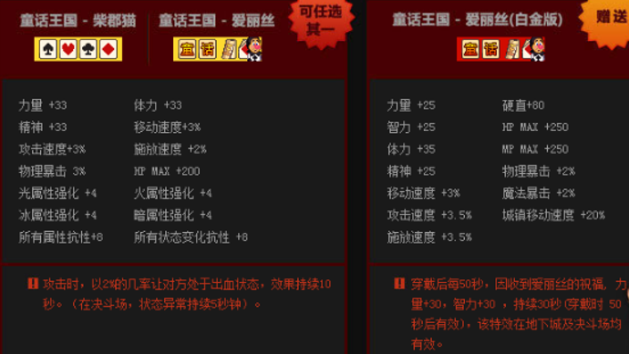 12年的套装主题是爱丽丝梦游仙境,鬼剑士的兔子先生,和女枪手的女仆装扮,是当时的一大亮点,并在今年首度增加了属强的属性,2012年五一称号首度加入了属强属性,不过副属性的这个中毒状态完全没卵用,不过出血的副属性对于狂战来说是相当大的提升,当年这个礼包一套给两个称号,赠送的童话王国白金版属性倒还不错,装备时可以增加力量和智力。