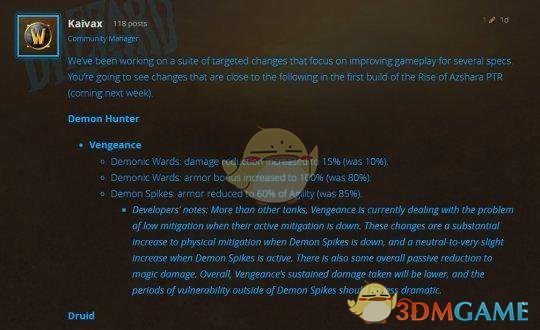 相比其他坦克专精,复仇恶魔猎手在主动减伤技能处于冷却时,自身的减伤能力就会比较底下。这些改动将大幅提高恶魔尖刺冷却时的物理减伤能力,而在恶魔尖刺激活时略微提高减伤能力。对于魔法伤害也有一些总体的被动减伤。总体而言,复仇专精受到的持续性伤害将有所降低,恶魔尖刺冷却时的脆弱期将有所减少。