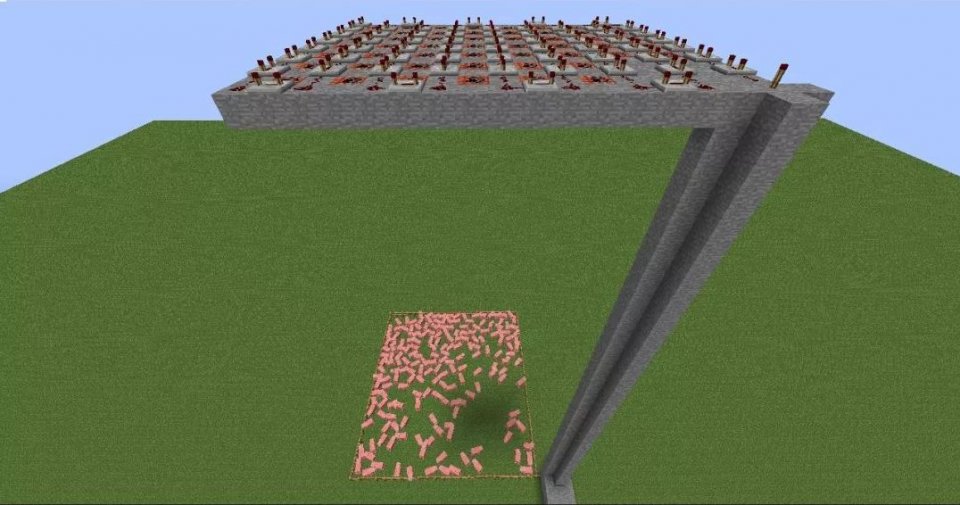 其实这个装置的原理恩简单,在地面数十米的高空中有一个镶嵌着TNT的平台,当红石机关启动,TNT们将会被激活并落下,然后下面的猪猪就要遭殃。