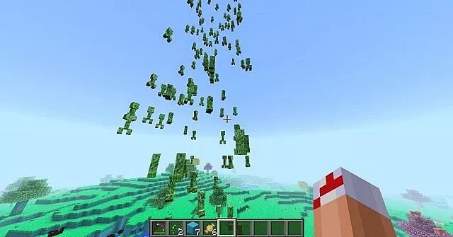 好了,看过了下TNT、下奶牛会后,好戏上场了,那就是来一场苦力怕雨!作者为了烘托气氛,甚至将整个环境都变成了这喜人的绿色。