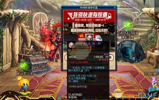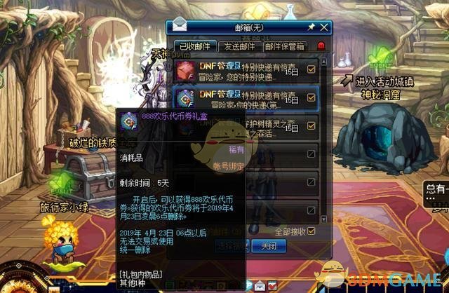 不过我们看到快递礼盒中并没有出现888点券,其实这个是一个小套路啦,因为代币券是直接给邮件发送的,大家上号第一件事要开邮箱查看哦!而且代币券删除日期是五一套上架更新当天,也就是别想着用来买五一套了,策划呵呵~
