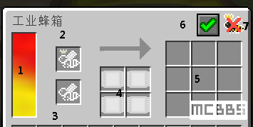 1、能量槽;2、放置公主蜂;3、放置雄峰;4、放置本mod框架;5、产物;6、蜂箱控制开关;7、蜂箱状态提示
