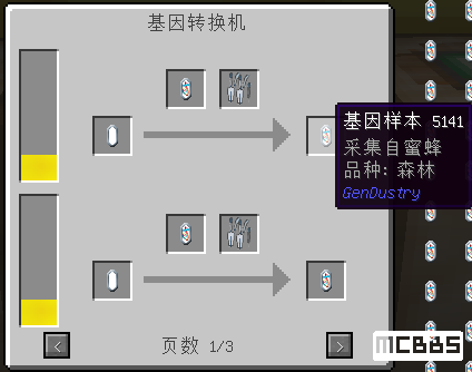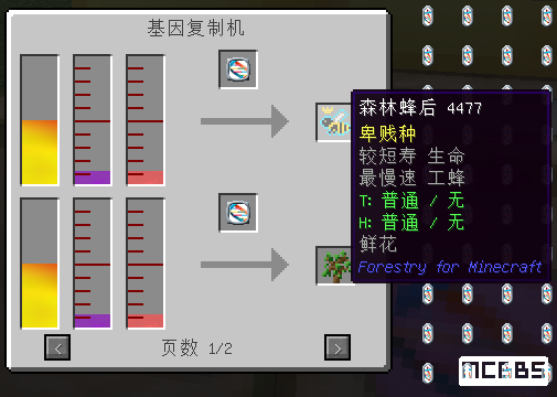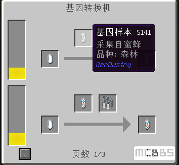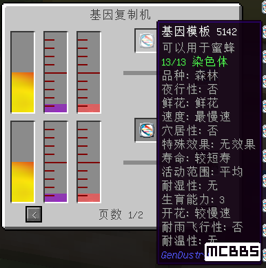 将蜜蜂、树木及蝴蝶按照基因模板进行改造。在不会缺少某种蜜蜂,或为了稳定基因繁殖无数代蜜蜂。前提是采集到你需要的基因,采集基因用下面的机器。
