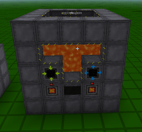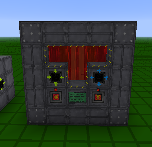 左上绿色箭头指的框放入黄铀锭,右上自动排出蓝晶锭。中下两个按键可以手动排出机器内的蓝晶/黄铀。右下的两个按钮可以选择模式,不同模式有不同作用。绿色的是输出模式,可以自动从外部的管道,箱子等方式接收燃料,自动补充。蓝色的是输出模式,可以自动输出蓝晶到相接的管道,箱子。不同模式材质不同。