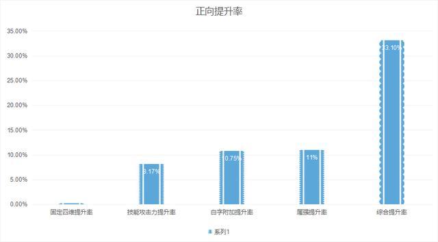 我们先将黑洞湮灭升级江山如画后的正面提升属性整理分析,在我们制作的图标中,绿色提升量属于正向提升的是5点的固定四维;8%的技能攻击力;20%的白字附加伤害;48点的全属性强化,我们分别计算出这些提升率。