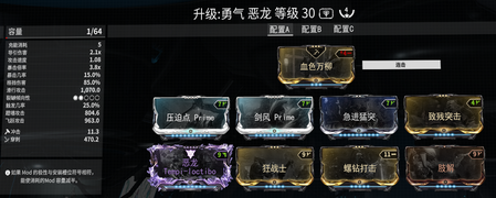 考虑到武器在无等级时能装备的Mod有限,应当尽量选择适合自己的地图。高段位玩家拥有更多的初始容量,武器伤害更高,所以偷袭升级武器会更加轻松。 推荐武器Mod:压迫点、剑风、热病打击、电击触点、熔岩冲击、北风等。