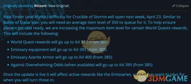 4月23日将会开启随机和史诗难度的风暴熔炉。跟达萨罗之战一样,你需要达到350装等才能排随机本。为了帮助玩家能够更好的排本,我们计划提高世界任务的最高装等奖励。包括以下几种: