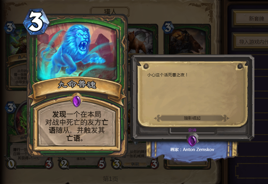 最后就是一张新版本的卡牌“九命兽魂”,要知道这张卡牌曾被王师傅评价为1分卡。但随着时间的推移大家发现这张卡还是非常好用,不管是在机械猎的卡组中还是亡语猎的卡组中都占据比较重要的作用,而且在这套卡牌中也算是非常重要的卡牌之一,至于效果嘛谁用谁知道!