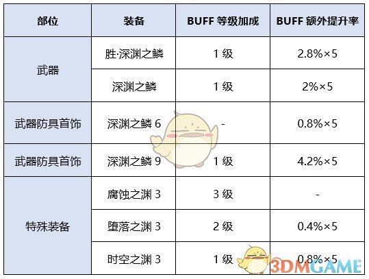 换装搭配新换装以深渊之鳞9件套(防具5+首饰3+武器1)为基础,之后视个人情况选择不同的特殊三件套进行搭配。以完美换装为例,装备自带3级BUFF,计算时装、宠物、光环、称号4级后,再堆3级即可完美,这3级需要节日宝珠、白金徽章、换装称号完成,需要一定的钞能力支持。若钞能力不足,可选用腐蚀之渊提升更多等级。下表为不同搭配的装备带来的等级、额外提升率。【深渊之鳞+胜·武器+时空之渊】为完美换装。