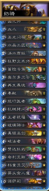 卡组说明:奶骑是现在很多骑士的基础卡组,像什么元气骑和机械克苏恩骑的基础卡组。这些卡组都是由奶骑发展而来的。奶骑之所以可以发展成这些卡组,是因为它有较强的防御能力,可以坚持到OTK。因此,练习好奶骑,就是练习好慢速骑士的基础。