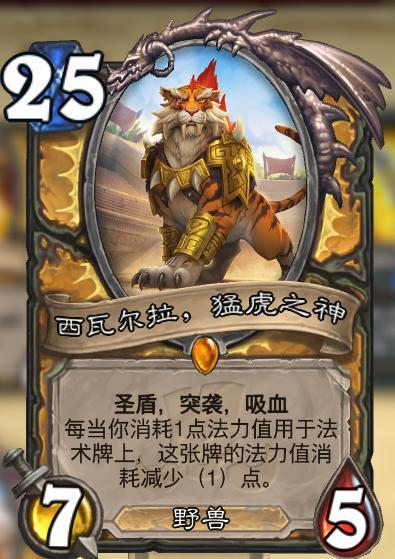 猛虎之神也是一张很强的卡,后期解场+保命,不怕冰冻还有圣盾,很厉害的一张卡,作为奶骑必带。