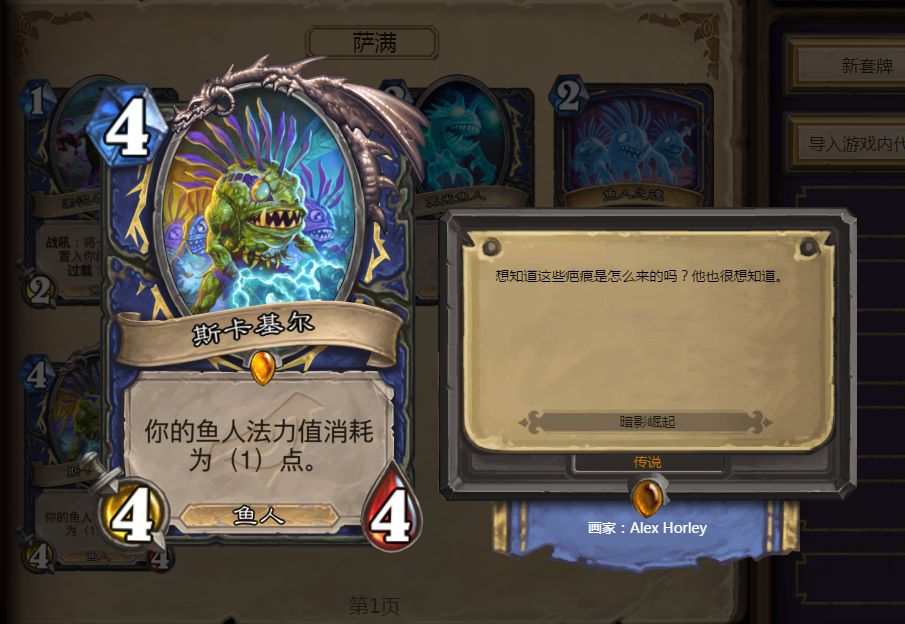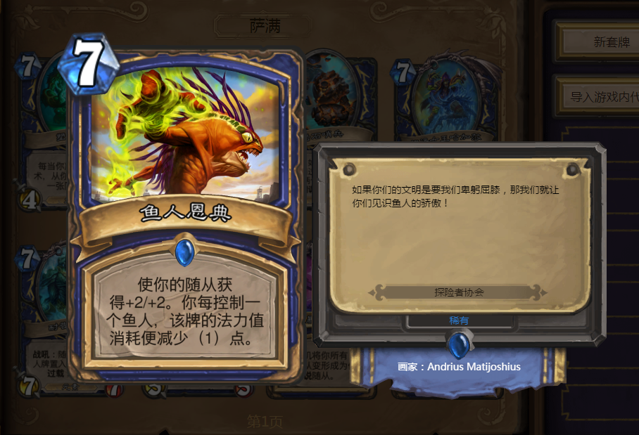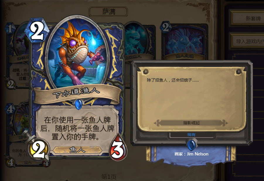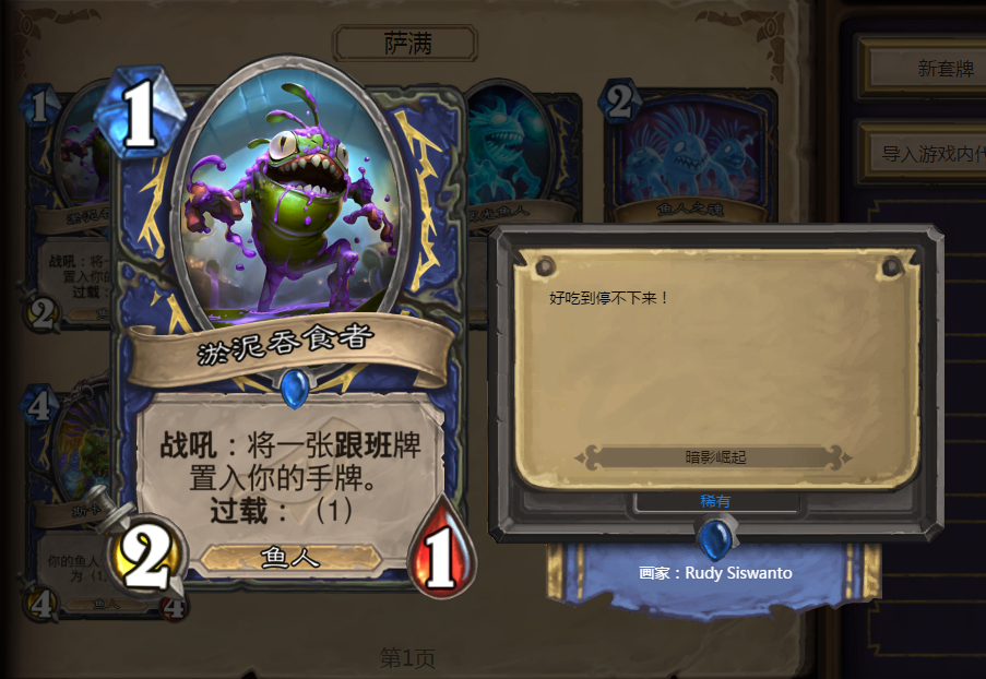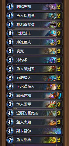 卡组的大体构架和之前的鱼人萨差不多,只不过在原有的基础上加入了一些新版本的鱼人卡。首先是“淤泥吞食者”,1费2/1过载1的身材讲道理有点亏,但效果是将一张“跟班卡”置入你的手牌,对比2费1/1的老鼠这张卡还是非常不错的,而且“跟班卡”在新版本的实力大家有目共睹,这张卡必须两张满编。