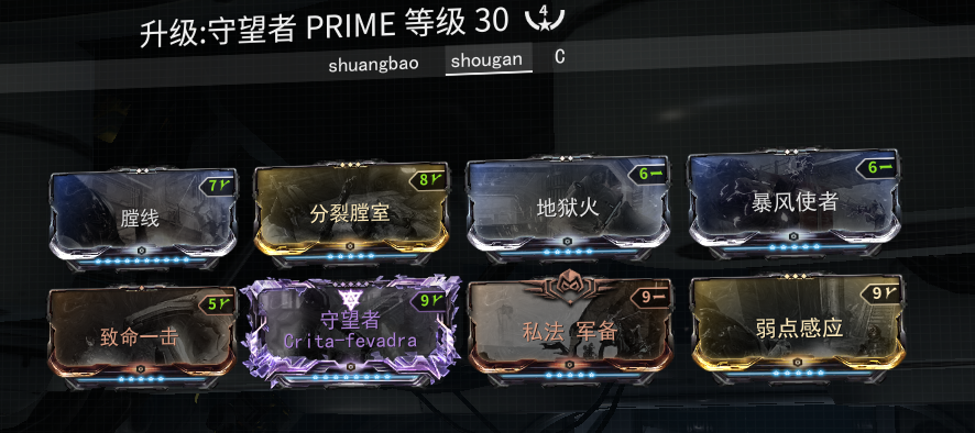 守望者打夜灵配置,因为守望是所有狙击中连击时间最短的所以需要高多重来快速达到连击伤害加成,如果紫卡有-弹夹容量可以吧平原多重上银首发。