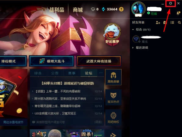 1、进入游戏后,客户端右上角有一个齿轮,那是设置;