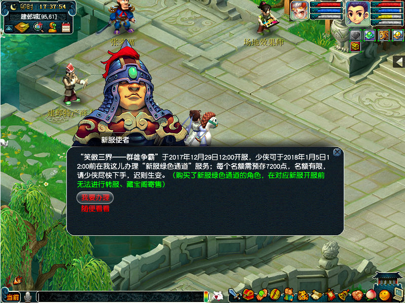“新服使者”会在建邺城(91,61)为大家办理绿色通道服务。