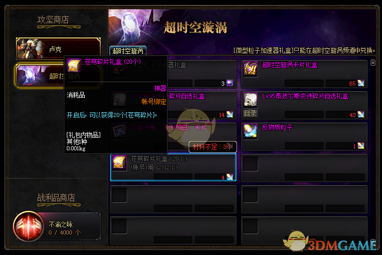 考虑到普雷团本上线前后,玩家大号超界五防具基本做齐,这样每周获得的账号绑定材料可以全部给到小号,借此来加速小号的毕业。另外,距离漩涡减负的正式上线还有2个周时间,这段时间重点还是要放在95a+史诗上,大号的反物质粒子也可以先兑换苍穹碎片给到小号。
