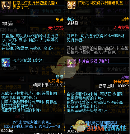 在眩惑之塔获取的材料可以用来兑换95史诗武器,包含随机和自选两种,推荐小号选择150个材料的一种,大号选择随机罐子兑换史诗灵魂。按照低保需要玩家打30天获取武器,但实际上随机奖励也有材料,所以95史诗的获取大概只需要20天。