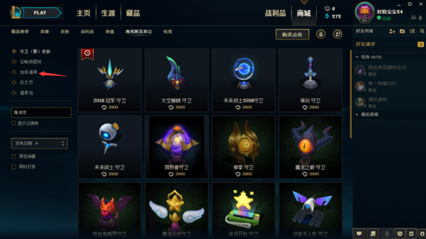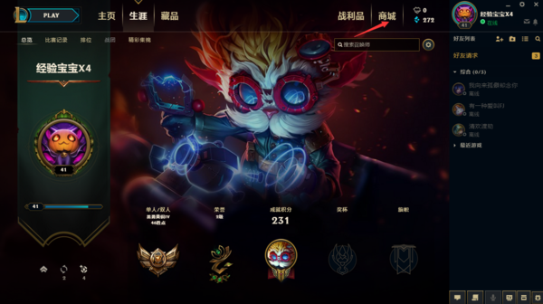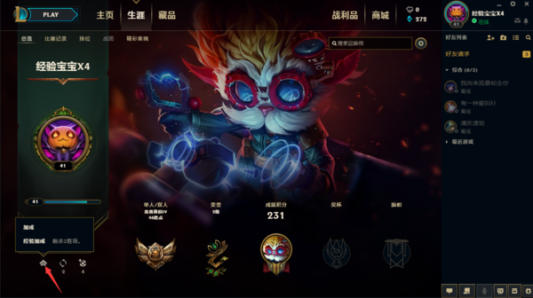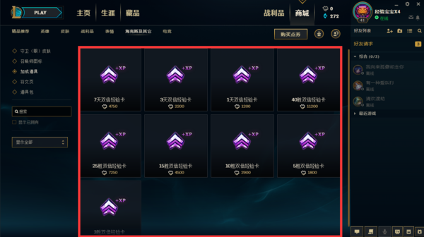 登录游戏界面找到左边的生涯,点击。在生涯界面,指向左下角的经验加成图标,就会显示了。经验加成卡用完了可以在商城购买,点击右上方的商城。进入商城后点击海克斯及其他。进入后点击加成道具就能购买了。