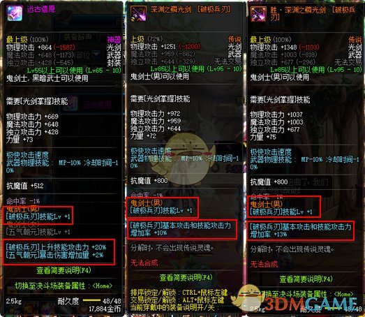 首先就武器描述上,剑神的三把光剑都是加一级破极兵刃,而远古遗愿则是上升技能攻击力+20%,深渊之鳞则是基本攻击和技能攻击力增加率+10%,胜深渊之鳞则是基本攻击和技能攻击力+13%。就单单字面数据看似是远古遗愿加成最高。