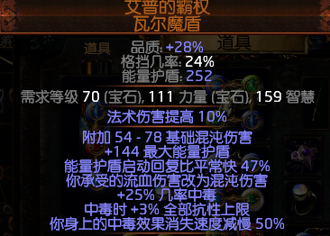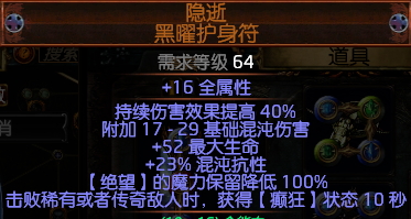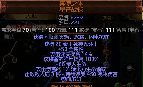 说明:衣服位置只要6个洞不需要6连,洗反色可以先用120个换色到工艺台操作成3个蓝洞,然后逐步开6洞,最后用辛迪加工艺(世界收)改造成适合孔洞数量的白孔。这件衣服自带死神光环技能不需要手动开,打怪自己就开了。死神光环初始伤害为450的持续混沌,大家感觉可能很低,但是你参考下其他的持续伤害的固定值就觉得不低了。秘术增强只起到给死神光环提供持续时间的标签,可以让极速腐化和持续时间缩短的more产生效果,所以1级就可了。
