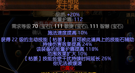 说明:因为武器与腐化出施法速度的手套(武器30+手套10=40+施法速度),所以不要带施法速度。手套自带22级枯萎,相当于一个20级宝石和一个3级赋予,整体算5.5连。枯萎最高可叠20层,伤害爆发都很强力。另外,枯萎技能的效果分成两部分:第一,叠层的伤害;第二,怪物一侧的增伤。两部分时间是分开的。