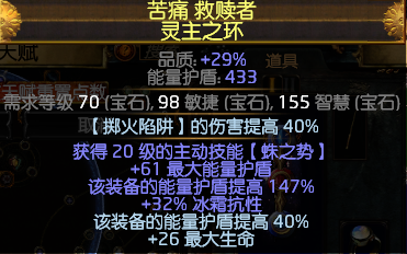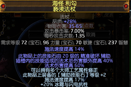 这个法杖是本BD的关键,基本最大的花费就是它了。这个法杖的产出需要你对词缀列表了如指掌,其次,要对制作装备的方式分析透彻。我只提一些建议。1.不适合用“宝石等级+额外技能”增伤,楞面化石极其昂贵但是属性随机,点到破产都未必出来。2.必备以太化石+腐蚀化石。腐蚀化石可以屏蔽元素属性,否则精准破坏有相抵属性,备选化石:五彩化石,震颤化石,金属化石。3.制作途径多种多样,可以互相搭配,诸如利用魔物园。3.必须是亵渎法杖的底子,物品等级要高。4.大师词缀“辅助技能”与单属性宝石等级冲突,但与“全部宝石+1”不冲突。5.这个法杖我是用4孔共振器做出来的。