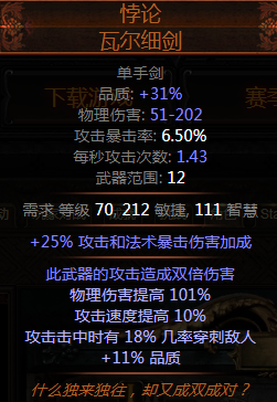词缀:物理伤害提高,攻击速度,20%几率穿刺,品质