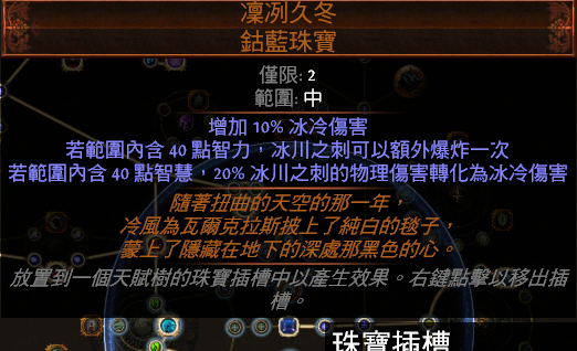,这个珠宝个人感觉对我们这个直接的提升非常大,在加上+1地雷头的物转冰附魔的稀有性,这个珠宝的存在意义瞬间拉满(虽然可能会很贵,但他确实很优秀),反正我是已经爱上这个珠宝了~,总是就是不管绑不绑这珠宝,其他只要还有宝石孔,依旧还是要去找爆伤珠宝!