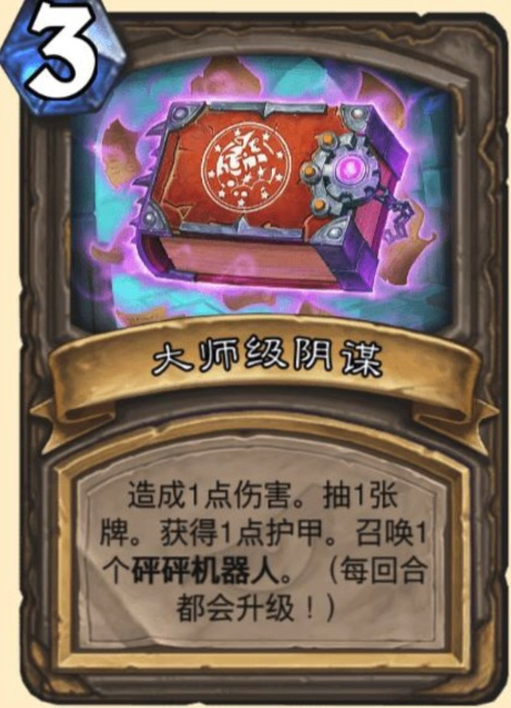 这里再给大家推荐一张神级的宝藏卡——大师级阴谋。这张宝藏卡的效果是:造成1点伤害,抽一张牌,获得1点护甲,召唤一个砰砰机器人。(每回合都会升级)。这哪是什么大师级阴谋,简直就是大师级赖皮啊!玩家看到这张集解场、回复、站场以及补充手牌能力于一体的随从简直就是可以无脑拿啊!这张牌是有成长曲线的,留在手牌中两到三个回合在打出就已经是很赚了,更别说留在手牌中五个回合,这就已经完爆终极感染了啊!当然了,如果这张卡牌在手牌里呆的时间过长的话,它的成长曲线也是会有所下降的,毕竟场面上只允许站七个随从,如果太贪的话,这张卡牌的价值也是会有所下降的。
