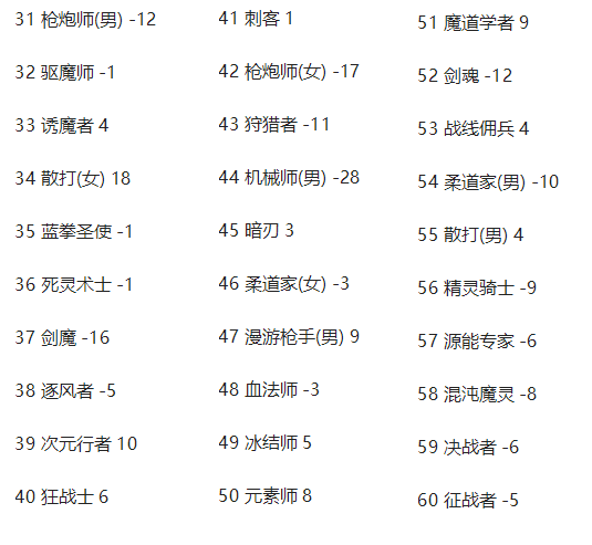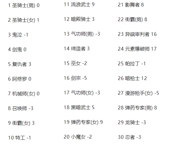 而30开外的基本上都是下水道职业,可以忽略了,系统一波狂战士这回又是垫底了,而出人意料的是剑魂的排名竟然比狂战士的还要低,这回狂战士和剑魂真是双双垫底了,鬼剑士中就属这两兄弟最不争气了。
