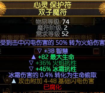 减抗是更少,负面效果惊人,但是正面作用同样惊人!可以配合双子魔符获得冰霜或者闪电伤害全部转换为火焰伤,好像矿洞又有新套路了.