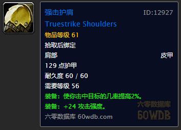 强击肩是黑石塔上层老1BOSS掉率的一件蓝装,它的属性非常暴力,不加任何耐力敏捷力量,只增加2%的命中和26点攻强。在一个前期非常缺少命中的时代,这件装备意味着什么我就不必多说了。小德,猎人,狂暴战,盗贼都是对他蠢蠢欲动。