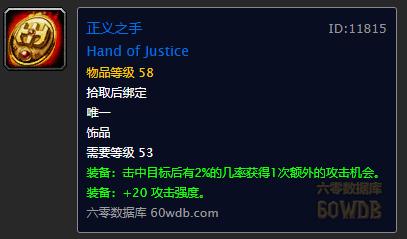 这两件装备都是出产于黑石深渊最后一个BOSS皇帝。其中正义之手的属性和特效太优美,以至于猎人小德都对它念念不忘,在MC前期,很多刷屏都是因为这件饰品而产生的,什么某某猎人抢了盗贼的饰品等等,但是我想问,猎人在这个时候有比正义之手更好的饰品么?答案是没有。至于反对者,特效是触发两次额外的攻击,和正义之手相辅相成,是狂暴战前期最好的主手,副手配上恶魔JJ,在团本里就是一个无法阻止的输出怪兽啊。