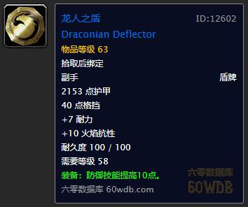 同样产至黑石塔上层的掉落,是每一个MT都必须入手的龙人之盾,说真的,当年如果你没有这把盾,你进团本根本就没有资格去争MT的位置,这把盾由于出至最后一个BOSS龙人将军,所以战士朋友必须全程耐心的把副本打完,其中的心酸自己去体会吧。