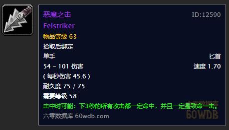 这把紫色的特效逆天的匕首还是产至黑石塔上层,可见黑石塔上层真的是每一个职业必刷的副本啊。请注意,恶魔JJ可以双持,曾经的盗贼皇帝Shurrik就是一个双持恶魔JJ的盗贼,大家现在依然可以通过各种视频网站观看他60级变态的操作和逆天的伤害。这把武器对匕首贼和狂暴战都是在进入团本前无法替代的装备,想要碾压众生吗,去刷恶魔JJ吧,想要装逼必备吗,去刷恶魔JJ吧。