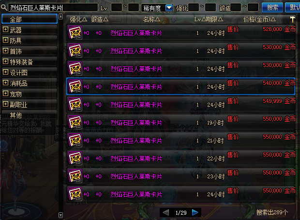 另外要注意,在拍卖行里,23物攻的卡片依然维持原价,每一张都要2000w以上的金币,所以这次护肩部位的附魔只能适用于魔法百分比职业。而造成价格区别较大的原因,应该是产出和bug,在卡片烈焰石巨人莱斯上,出现了两种不同的附魔,28魔攻的一种产出量较高,有不少玩家提到了一个bug:28上衣、下装和武器的魔攻附魔,在合成时会变成真烈焰石巨人宝珠的属性,同样增加23点护肩魔攻。