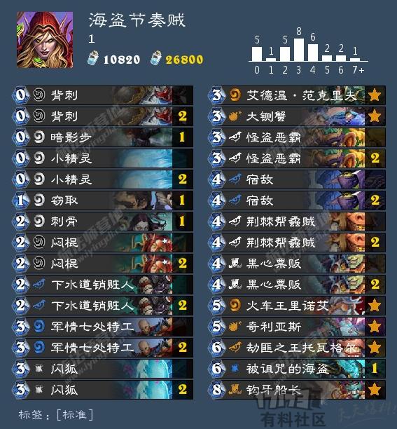 目前天梯节奏贼又有了一定的数量,不过和以往不同,不再依赖团伙劫掠了,而是依靠偷来的卡以及跟班抢节奏,毕竟团伙劫掠、伺机待发全部削弱了,再执着于这些卡,最终只会被吊打收场,因此我们肯定是要考虑改良的,于是就有了下面这套降速的海盗节奏贼。