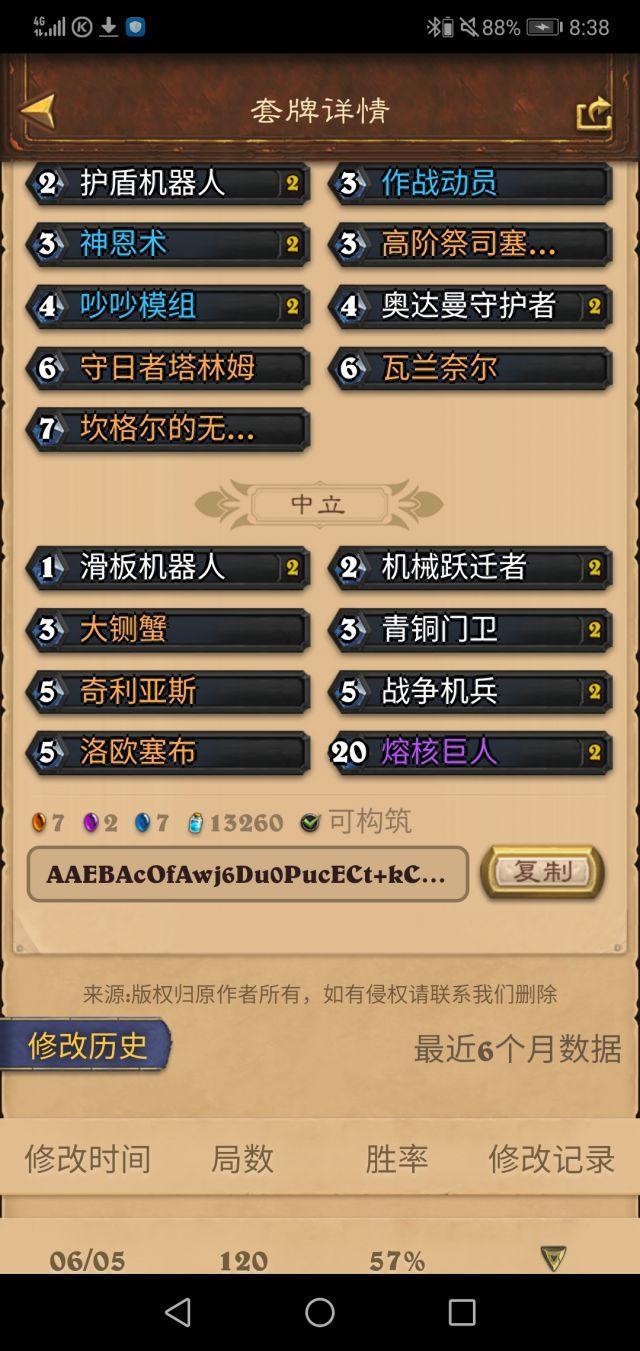 砰砰计划时代我所使用的初版大军骑,全程上传说并打到了第7,那个月的最终胜率有56%和现在是神奇的一致.说实话虽然我认为绝对强度绝对不敌现在机器崛起版的,但当时的对手放到现在也是强度惊人你或许会怀疑这样的套牌怎么能与他们对敌.