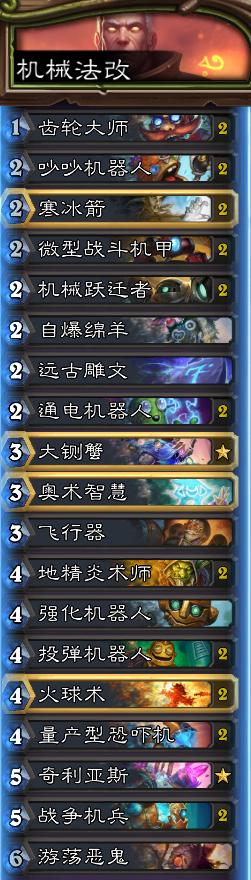 说完了"机械崛起"活动,最近天梯中的卡组也是层出不穷,各种新套路比比皆是,都是受益于"机械崛起"这个活动。不过小编却在"机械崛起"这个活动中走了一次复古风,利用这次的机械崛起以及砰砰计划中的部分机械卡牌,打造出了一套全新的复古机械法,话不多说,卡组奉上
