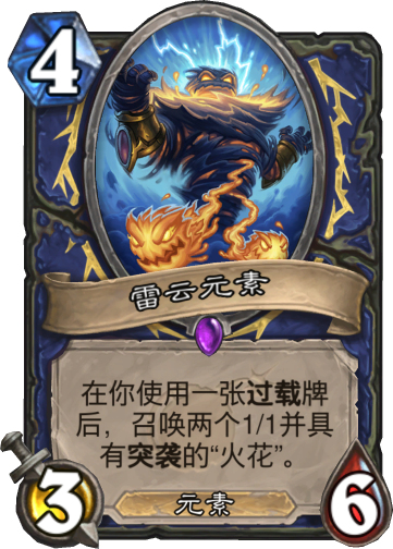 另外一张和过载配合得比较好的就是雷云元素,在经过机械崛起的加强后是完全不亏身材了,只要他在场,我们的过载牌就能发挥额外的效果,召唤出来的火花在解场和站场方面都能起到很大的作用。