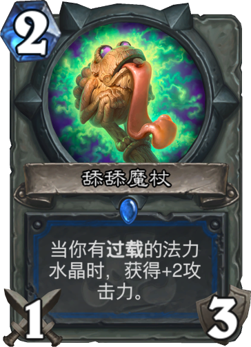前面说了过载在这套卡组中有很多配合,舔舔魔杖就是其中比较关键的一张,有过载的话是33的属性,比起以前的战士神级武器小斧头还要强!自然也能帮助我们在前期轻松抢到场上的节奏了。