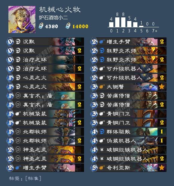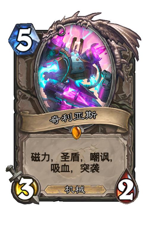 奇利亚斯在所有套牌中出现的概率高达63.2%,远远甩开第二名一倍多的百分点,真可谓是名副其实的29+1的单卡。奇利亚斯不管是在机械卡组中还是非机械卡组中都有自己的一席之地,磁力、圣盾、嘲讽、吸血、突袭这些关键词构成了奇利亚斯的强大,但或许这张单卡也并不强大,对于对战双方而言,奇利亚斯都是可以接受的存在,并没有那么超模。或许这张卡就是去年设计最成功的单卡了吧!