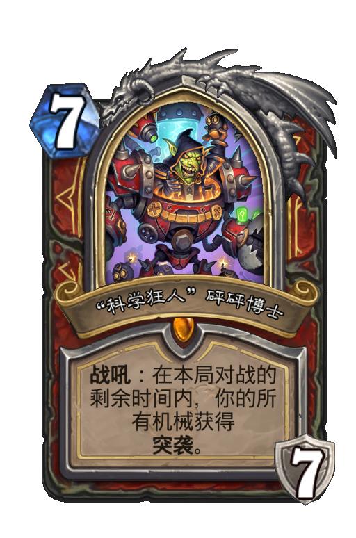"科学狂人"砰砰博士作为战士的英雄牌在所有DK退环境以后显得无比强力,砰砰博士的技能在对局中展现出的value非常高,再加上能让机械突袭的光环效果,砰砰博士无愧为版本第一英雄卡。