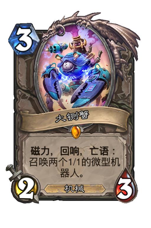 大铡蟹作为"机械崛起"补丁中新推出的橙卡,其完美的身材、灵活的特效、强力的属性都让他一跃成为大多数卡组的宠儿。3费2-3还带两个1-1亡语,可以说是完爆麦田傀儡了,再加上机械可以磁力、回响的特效,大铡蟹在场上有机械的情况下就可以起到冲锋的效果,即使场上没有机械可以磁力,不管是直接分开站场还是磁力buff自己站场对于对手来说都是非常头疼的。作为一张百搭牌,大铡蟹能够达到的打出胜率已经超出了卡牌本身的合理程度,小二认为这张卡遭到削弱的可能性非常大。