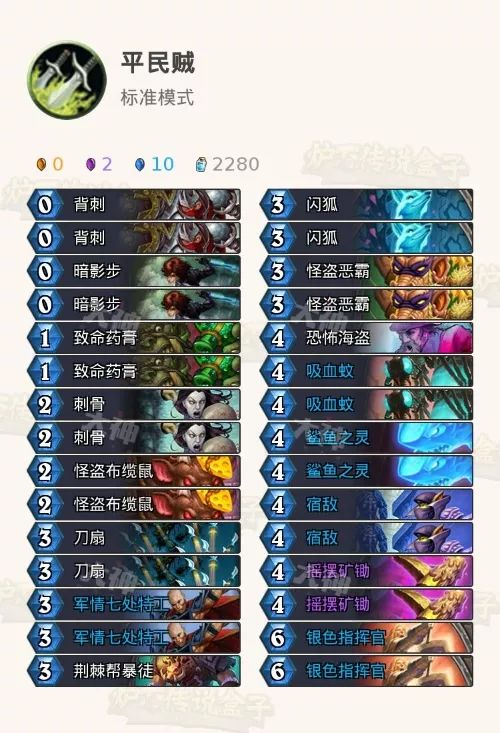 在构筑上这套盗贼只加入了摇摆矿锄两张紫卡,其他卡牌都是蓝卡,在传统的节奏贼上,我们去掉了大范、火车王、闷棍等卡,加入了3费曲线的优质单卡,闪狐、军七、暴徒等等,此外这里围绕鲨鱼之灵的战吼增益我们还特意有配合吸血蚊、怪盗恶霸、闪狐等等可以触发的随从。这里在补伤害中构筑了银色指挥官,两个冲锋的效果足以在中后期给很多卡组带来压力了!